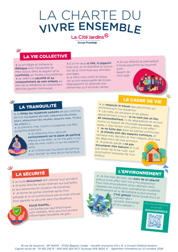Fruit d'un partenariat avec les représentants des locataires, notre Charte Vivre Ensemble est affichée dans tous les halls des résidences du parc de La Cité Jardins et diffusée à l'ensemble des locataires en annexe des avis d'échéance.